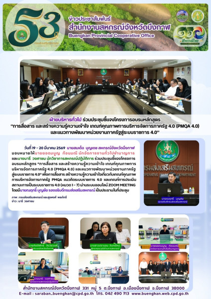 วันที่ 19 - 20 มีนาคม 2569 นายสมเด็จ บุญเดช สหกรณ์จังหวัดบึงกาฬ มอบหมายให้นายยอดมนูญ ก้อนมณี นักจัดการงานทั่วไปชำนาญการ และนางนารี วงศาชม นักวิชาการสหกรณ์ปฏิบัติการ ร่วมประชุมชี้แจงโครงการอบรมหลักสูตร “การสื่อสาร และสร้างความรู้ความเข้าใจ เกณฑ์คุณภาพการบริหารจัดการภาครัฐ 4.0 (PMQA 4.0) และแนวทางพัฒนาหน่วยงานภาครัฐสู่ระบบราชการ 4.0” เพื่อการสื่อสารสร้างความรู้ ความเข้าใจเกี่ยวกับเกณฑ์คุณภาพการบริหารจัดการภาครัฐ PMQA แนวคิดระบบราชการ 4.0 และเกณฑ์การประเมินสถานะการเป็นระบบราชการ 4.0 (หมวด 1 - 7) ผ่านระบบออนไลน์ Zoom Meeting โดยมีนายณฤทธิ์ บุญชัย รองอธิบดีกรมส่งเสริมสหกรณ์ เป็นประธานในที่ประชุม