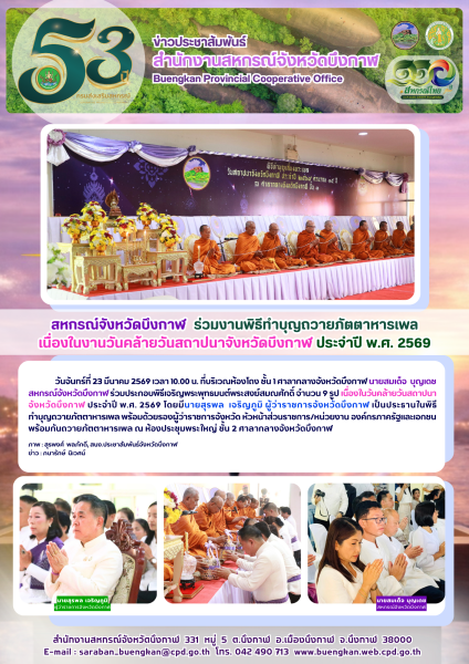 สหกรณ์จังหวัดบึงกาฬ ร่วมงานพิธีทำบุญถวายภัตตาหารเพล เนื่องในงานวันคล้ายวันสถาปนาจังหวัดบึงกาฬ ประจำปี พ.ศ. 2569