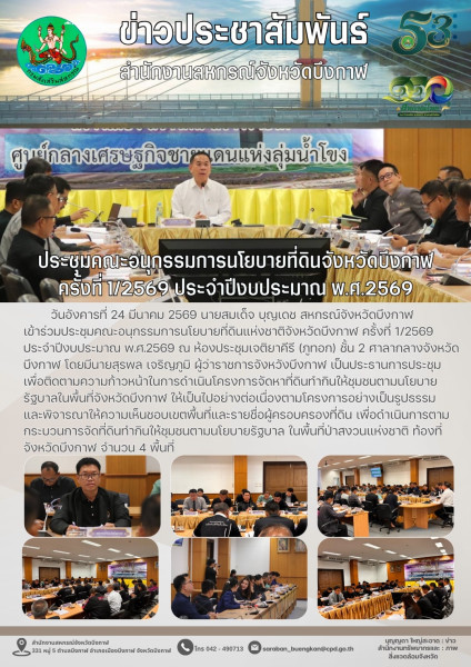 วันอังคารที่ 24 มีนาคม 2569 นายสมเด็จ บุญเดช สหกรณ์จังหวัดบึงกาฬ เข้าร่วมประชุมคณะอนุกรรมการนโยบายที่ดินแห่งชาติจังหวัดบึงกาฬ ครั้งที่ 1/2569 ประจำปีงบประมาณ พ.ศ.2569 ณ ห้องประชุมเจติยาคีรี (ภูทอก) ชั้น 2 ศาลากลางจังหวัดบึงกาฬ โดยมีนายสุรพล เจริญภูมิ ผู้ว่าราชการจังหวังบึงกาฬ เป็นประธานการประชุมเพื่อติดตามความก้าวหน้าในการดำเนินโครงการจัดหาที่ดินทำกินให้ชุมชนตามนโยบายรัฐบาลในพื้นที่จังหวัดบึงกาฬ ให้เป็นไปอย่างต่อเนื่องตามโครงการอย่างเป็นรูปธรรม และพิจารณาให้ความเห็นชอบเขตพื้นที่และรายชื่อผู้ครอบครองที่ดิน เพื่อดำเนินการตามกระบวนการจัดที่ดินทำกินให้ชุมชนตามนโยบายรัฐบาล ในพื้นที่ป่าสงวนแห่งชาติ ท้องที่จังหวัดบึงกาฬ จำนวน 4 พื้นที่