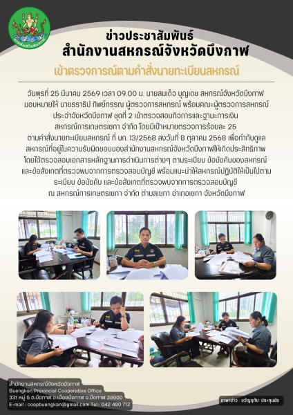 วันพุธที่ 25 มีนาคม 2569 เวลา 09.00 น. นายสมเด็จ บุญเดช สหกรณ์จังหวัดบึงกาฬ มอบหมายให้ นายธราธิป ทิพย์กรรณ ผู้ตรวจการสหกรณ์ พร้อมคณะผู้ตรวจการสหกรณ์ประจำจังหวัดบึงกาฬ ชุดที่ 2 เข้าตรวจสอบกิจการและฐานะการเงินสหกรณ์การเกษตรเซกา จำกัด โดยมีเป้าหมายตรวจการร้อยละ 25 ตามคำสั่งนายทะเบียนสหกรณ์ ที่ บก. 13/2568 ลงวันที่ 8 ตุลาคม 2568 เพื่อกำกับดูแลสหกรณ์ที่อยู่ในความรับผิดชอบของสำนักงานสหกรณ์จังหวัดบึงกาฬให้เกิดประสิทธิภาพ โดยได้ตรวจสอบเอกสารหลักฐานการดำเนินการต่างๆ ตามระเบียบ ข้อบังคับของสหกรณ์และข้อสังเกตที่ตรวจพบจากการตรวจสอบบัญชี พร้อมแนะนำให้สหกรณ์ปฏิบัติให้เป็นไปตามระเบียบ ข้อบังคับ และข้อสังเกตที่ตรวจพบจากการตรวจสอบบัญชี ณ สหกรณ์การเกษตรเซกา จำกัด ตำบลเซกา อำเภอเซกา จังหวัดบึงกาฬ