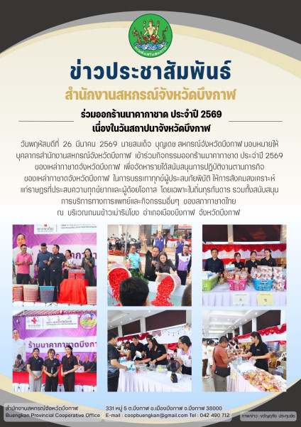 วันพฤหัสบดีที่ 26 มีนาคม 2569 นายสมเด็จ บุญเดช สหกรณ์จังหวัดบึงกาฬ มอบหมายให้บุคลากรสำนักงานสหกรณ์จังหวัดบึงกาฬ เข้าร่วมกิจกรรมออกร้านนาคากาชาด ประจำปี 2569 ของเหล่ากาชาดจังหวัดบึงกาฬ เพื่อจัดหารายได้สนับสนุนการปฏิบัติงานตามภารกิจของเหล่ากาชาดจังหวัดบึงกาฬ ในการบรรเทาทุกข์ผู้ประสบภัยพิบัติ ให้การสังคมสงเคราะห์แก่ราษฎรที่ประสบความทุกข์ยากและผู้ด้อยโอกาส โดยเฉพาะในถิ่นถุรกันดาร รวมทั้งสนับสนุนการบริการทางการแพทย์และกิจกรรมอื่นๆ ของสภากาชาดไทย ณ บริเวณถนนข้าวเม่าริมโขง อำเภอเมืองบึงกาฬ จังหวัดบึงกาฬ