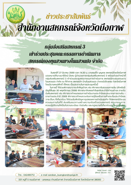 วันศุกร์ที่ 27 มีนาคม 2569 เวลา 14.30 น. นายสมเด็จ บุญเดช สหกรณ์จังหวัดบึงกาฬ มอบหมายให้ นางนารีรัตน์ มีแสง ผู้อำนวยการกลุ่มส่งเสริมสหกรณ์ 3 พร้อมด้วยเจ้าหน้าที่กลุ่มส่งเสริมสหกรณ์ 3 เข้าร่วมประชุมคณะกรรมการดำเนินการ สหกรณ์กองทุนสวนยางโนนสวนปอ จำกัด ณ ที่ทำการ สหกรณ์ฯ บ้านโนนสวนปออำเภอบึงโขงหลง จังหวัดบึงกาฬ โดยมีนายพงษ์ศักดิ์ ดีโคตร เป็นประธานในการประชุมครั้งนี้