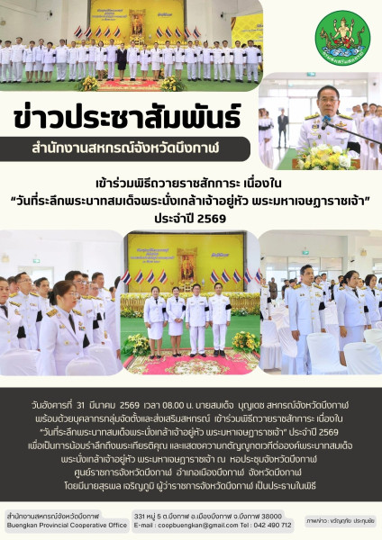 วันอังคารที่ 31 มีนาคม 2569 เวลา 08.00 น. นายสมเด็จ บุญเดช สหกรณ์จังหวัดบึงกาฬ พร้อมด้วยบุคลากรกลุ่มจัดตั้งและส่งเสริมสหกรณ์ เข้าร่วมพิธีถวายราชสักการะ เนื่องใน “วันที่ระลึกพระบาทสมเด็จพระนั่งเกล้าเจ้าอยู่หัว พระมหาเจษฏาราชเจ้า” ประจำปี 2569 เพื่อเป็นการน้อมรำลึกถึงพระเกียรติคุณ และแสดงความกตัญญูกตเวทีต่อองค์พระบาทสมเด็จพระนั่งเกล้าเจ้าอยู่หัว พระมหาเจษฏาราชเจ้า ณ หอประชุมจังหวัดบึงกาฬ ศูนย์ราชการจังหวัดบึงกาฬ อำเภอเมืองบึงกาฬ จังหวัดบึงกาฬ โดยมีนายสุรพล เจริญภูมิ ผู้ว่าราชการจังหวัดบึงกาฬ เป็นประธานในพิธี