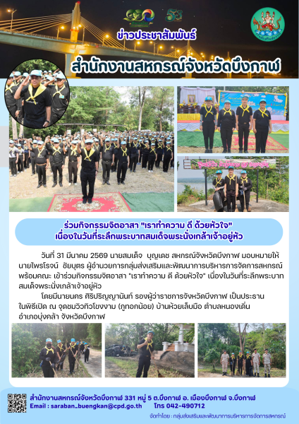 วันที่ 31 มีนาคม 2569 นายสมเด็จ บุญเดช สหกรณ์จังหวัดบึงกาฬ มอบหมายให้นายไพรโรจน์ ชัยบุตร ผู้อำนวยการกลุ่มส่งเสริมและพัฒนาการบริหารการจัดการสหกรณ์ พร้อมคณะ เข้าร่วมกิจกรรมจิตอาสา "เราทำความ ดี ด้วยหัวใจ" เนื่องในวันที่ระลึกพระบาทสมเด็จพระนั่งเกล้าเจ้าอยู่หัว