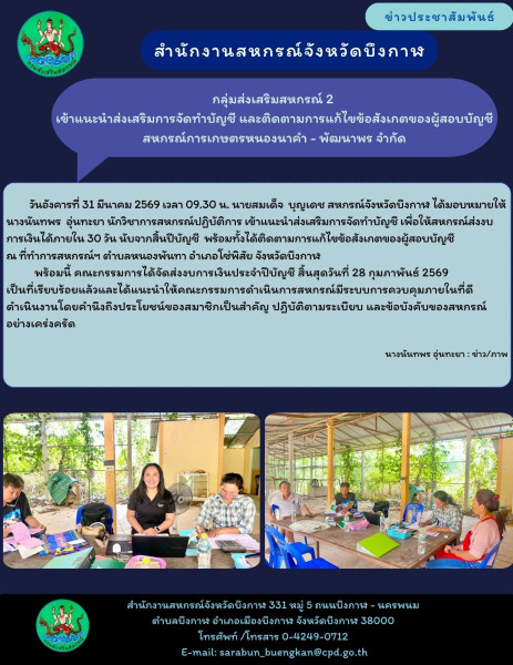 วันอังคารที่ 31 มีนาคม 2569 เวลา 09.30 น. นายสมเด็จ บุญเดช สหกรณ์จังหวัดบึงกาฬ ได้มอบหมายให้ นางนันทพร อุ่นทะยา นักวิชาการสหกรณ์ปฏิบัติการ เข้าแนะนำส่งเสริมการจัดทำบัญชี เพื่อให้สหกรณ์ส่งงบการเงินได้ภายใน 30 วัน นับจากสิ้นปีบัญชี พร้อมทั้งได้ติดตามการแก้ไขข้อสังเกตของผู้สอบบัญชี ณ ที่ทำการสหกรณ์ฯ ตำบลหนองพันทา อำเภอโซ่พิสัย จังหวัดบึงกาฬ