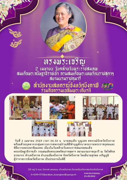 วันที่ 2 เมษายน 2569 เวลา 06.30 น นายสมเด็จ บุญเดช สหกรณ์จังหวัดบึงกาฬ พร้อมด้วยบุคลากรกลุ่มตรวจการสหกรณ์ ร่วมพิธีทำบุญตักบาตรถวายพระราชกุศลและพิธีถวายพระพรชัยมงคล เนื่องในวันคล้ายวันพระราชสมภพสมเด็จพระกนิษฐาธิราชเจ้า กรมสมเด็จพระเทพรัตนราชสุดาฯ สยามบรมราชกุมารี ณ วัดโชติรสธรรมากร ตำบลบึงกาฬ อำเภอเมืองบึงกาฬ จังหวัดบึงกาฬ โดยมีนายสุรพล เจริญภูมิ ผู้ว่าราชการจังหวัดบึงกาฬ เป็นประธานในพิธี