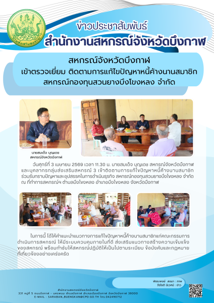 วันศุกร์ที่ 3 เมษายน 2569 เวลา 11.30 น. นายสมเด็จ บุญเดช สหกรณ์จังหวัดบึงกาฬ และบุคลากรกลุ่มส่งเสริมสหกรณ์ 3 เข้าติดตามการแก้ไขปัญหาหนี้ค้างนานสมาชิก ร่วมรับทราบปัญหาและอุปสรรคในการดำเนินธุรกิจ สหกรณ์กองทุนสวนยางบึงโขงหลง จำกัด ณ ที่ทำการสหกรณ์ฯ ตำบลบึงโขงหลง อำเภอบึงโขงหลง จังหวัดบึงกาฬ