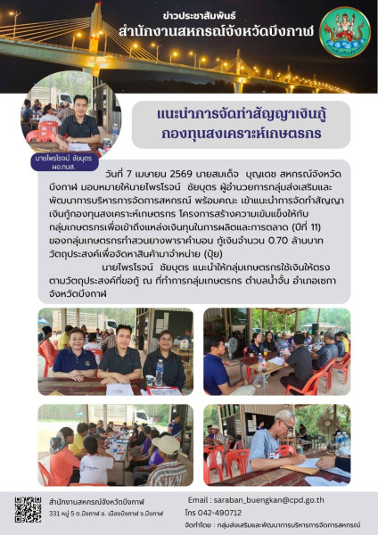 วันที่ 7 เมษายน 2569 นายสมเด็จ บุญเดช สหกรณ์จังหวัดบึงกาฬ มอบหมายให้นายไพรโรจน์ ชัยบุตร ผู้อำนวยการกลุ่มส่งเสริมและพัฒนาการบริหารการจัดการสหกรณ์ พร้อมคณะ เข้าแนะนำการจัดทำสัญญาเงินกู้กองทุนสงเคราะห์เกษตรกร โครงการสร้างความเข้มแข็งให้กับกลุ่มเกษตรกรเพื่อเข้าถึงแหล่งเงินทุนในการผลิตและการตลาด (ปี 11) ของกลุ่มเกษตรกรทำสวนยางพาราคำบอน กู้เงินจำนวน 0.70 ล้านบาท วัตถุประสงค์เพื่อจัดหาสินค้ามาจำหน่าย (ปุ๋ย) นายไพรโรจน์ ชัยบุตร แนะนำให้กลุ่มเกษตรกรใช้เงินให้ตรงตามวัตถุประสงค์ที่ขอกู้ ณ ที่ทำการกลุ่มเกษตรกร ตำบลน้ำจั้น อำเภอเซกา จังหวัดบึงกาฬ