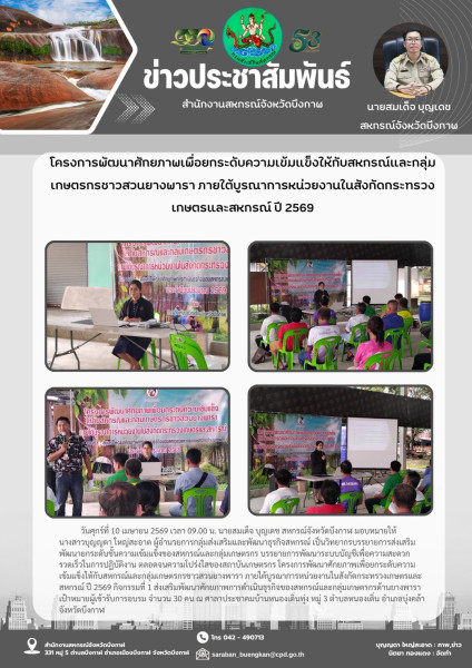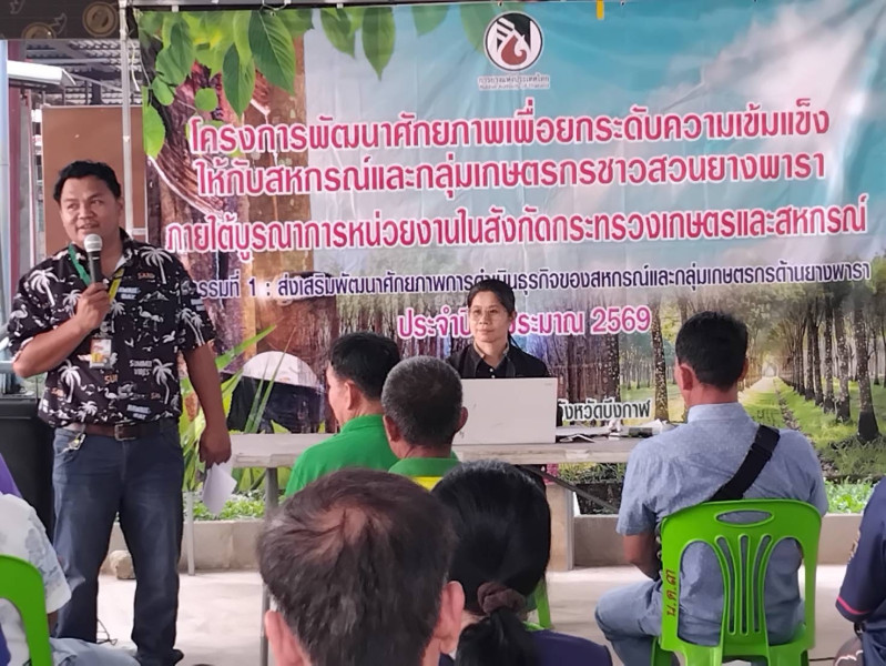 วันศุกร์ที่ 10 เมษายน 2569 เวลา 09.00 น. นายสมเด็จ บุญเดช สหกรณ์จังหวัดบึงกาฬ มอบหมายให้ นางสาวบุญญดา ใหญ่สะอาด ผู้อำนวยการกลุ่มส่งเสริมและพัฒนาธุรกิจสหกรณ์ เป็นวิทยากรบรรยายการส่งเสริมพัฒนายกระดับชั้นความเข้มแข็งของสหกรณ์และกลุ่มเกษตรกร บรรยายการพัฒนาระบบบัญชีเพื่อความสะดวกรวดเร็วในการปฏิบัติงาน ตลอดจนความโปร่งใสของสถาบันเกษตรกร โครงการพัฒนาศักยภาพเพื่อยกระดับความเข้มแข็งให้กับสหกรณ์และกลุ่มเกษตรกรชาวสวนยางพารา ภายใต้บูรณาการหน่วยงานในสังกัดกระทรวงเกษตรและสหกรณ์ ปี 2569 กิจกรรมที่ 1 ส่งเสริมพัฒนาศักยภาพการดำเนินธุรกิจของสหกรณ์และกลุ่มเกษตรกรด้านยางพารา เป้าหมายผู้เข้ารับการอบรม จำนวน 30 คน ณ ศาลาประชาคมบ้านหนองเดิ่นทุ่ง หมู่ 3 ตำบลหนองเดิ่น อำเภอบุ่งคล้า จังหวัดบึงกาฬ
