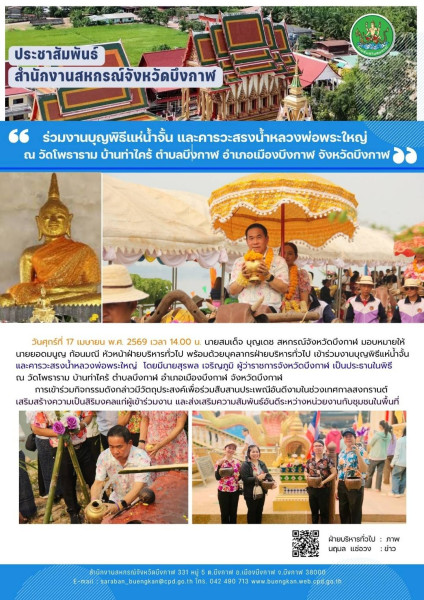 วันศุกร์ที่ 17 เมษายน พ.ศ. 2569 เวลา 14.00 น. นายสมเด็จ บุญเดช สหกรณ์จังหวัดบึงกาฬ มอบหมายให้นายยอดมนูญ ก้อนมณี หัวหน้าฝ่ายบริหารทั่วไป พร้อมด้วยบุคลากรฝ่ายบริหารทั่วไป เข้าร่วมงานบุญพิธีแห่น้ำจั้น และคารวะสรงน้ำหลวงพ่อพระใหญ่ โดยมี นายสุรพล เจริญภูมิ ผู้ว่าราชการจังหวัดบึงกาฬ เป็นประธานในพิธี ณ วัดโพธาราม บ้านท่าไคร้ ตำบลบึงกาฬ อำเภอเมืองบึงกาฬ จังหวัดบึงกาฬ