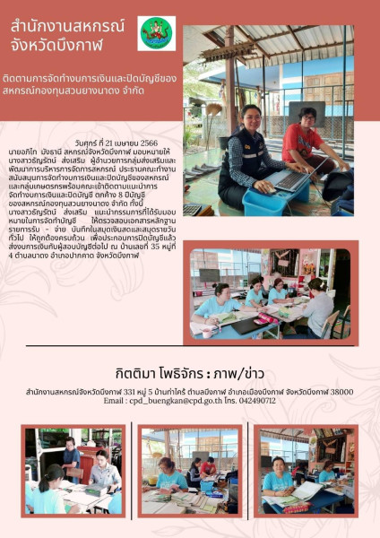 วันศุกร์ ที่ 21 เมษายน 2566 นายอภิไท มังธานี สหกรณ์จังหวัดบึงกาฬ มอบหมายให้นางสาวธัญรัตน์ ส่งเสริม ผู้อำนวยการกลุ่มส่งเสริมและพัฒนาการบริหารการจัดการสหกรณ์ ประธานคณะทำงานสนับสนุนการจัดทำงบการเงินและปิดบัญชีของสหกรณ์และกลุ่มเกษตรกร พร้อมคณะเข้าติดตาม แนะนำการจัดทำงบการเงินและปิดบัญชี ตกค้าง 8 ปีบัญชี ของสหกรณ์กองทุนสวนยางนาดง จำกัด