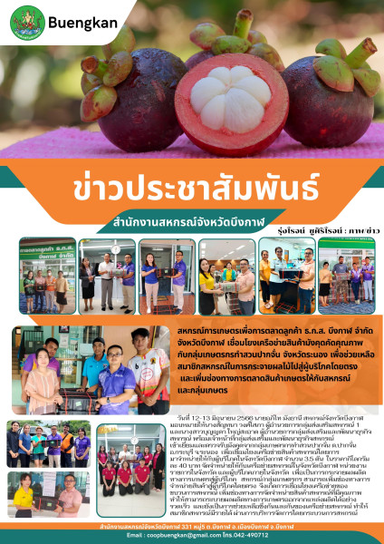 สหกรณ์การเกษตรเพื่อการตลาดลูกค้า ธ.ก.ส. บึงกาฬ จำกัด จังหวัดบึงกาฬ เชื่อมโยงเครือข่ายสินค้ามังคุดคัดคุณภาพ กับกลุ่มเกษตรกรทำสวนปากจั่น จังหวัดระนอง เพื่อช่วยเหลือสมาชิกสหกรณ์ในการกระจายผลไม้ไปสู่ผู้บริโภคโดยตรงและเพิ่มช่องทางการตลาดสินค้าเกษตรให้กับสหกรณ์และกลุ่มเกษตร วันที่ 12-13 มิถุนายน 2566 นายอภิไท มังธานี สหกรณ์จังหวัดบึงกาฬ มอบหมายให้นางสัญทนา วงศ์โสภา ผู้อำนวยการกลุ่มส่งเสริมสหกรณ์ 1 และนางสาวบุญญดา ใหญ่สะอาด ผู้อำนวยการกลุ่มส่งเสริมและพัฒนาธุรกิจสหกรณ์ พร้อมเจ้าหน้าที่กลุ่มส่งเสริมและพัฒนาธุรกิจสหกรณ์ เข้าเยี่ยมและตรวจรับมังคุดจากกลุ่มเกษตรกรทำสวนปากจั่น ต.ปากจั่น อ.กระบุรี จ.ระนอง เพื่อเชื่อมโยงเครือข่ายสินค้าสหกรณ์โดยการ มาจำหน่ายให้กับผู้บริโภคในจังหวัดบึงกาฬ จำนวน 3.5 ตัน ในราคากิโลกรัมละ 40 บาท จัดจำหน่ายให้กับเครือข่ายสหกรณ์ในจังหวัดบึงกาฬ หน่วยงานราชการในจังหวัด และผู้บริโภคภายในจังหวัด เพื่อเป็นการกระจายผลผลิตทางการเกษตรสู่ผู้บริโภค สหกรณ์/กลุ่มเกษตรกร สามารถเพิ่มช่องทางการจำหน่ายสินค้าสู่ผู้บริโภคโดยตรง จึงเกิดการเชื่อมโยงเครือข่ายของขบวนการสหกรณ์ เพิ่มช่องทางการจัดจำหน่ายสินค้าสหกรณ์ที่มีคุณภาพ ทำให้สามารถระบายผลผลิตทางการเกษตรออกจากแหล่งผลิตได้อย่างรวดเร็ว และยังเป็นการช่วยเหลือซึ่งกันและกันของเครือข่ายสหกรณ์ ทำให้สมาชิกสหกรณ์มีรายได้ ผ่านการบริหารจัดการโดยกระบวนการสหกรณ์