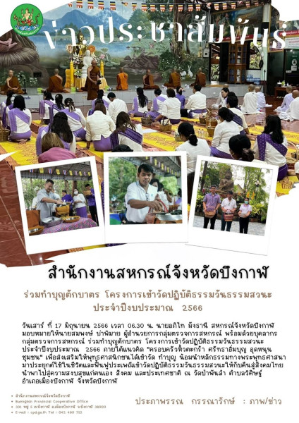 วันนี้ 17 มิถุนายน 2566 เวลา 06.30 น. นายอภิไท มังธานี สหกรณ์จังหวัดบึงกาฬ มอบหมายให้นายสมพงษ์ บ่าพิมาย ผู้อำนวยการกลุ่มตรวจการสหกรณ์ พร้อมด้วยบุคลากรกลุ่มตรวจการสหกรณ์ ร่วมทำบุญตักบาตร โครงการเข้าวัดปฏิบัติธรรมวันธรรมสวนะ ประจำปีงบประมาณ 2566 ภายใต้แนวคิด "ครอบครัวหิ้วตะกร้า ศรัทธาอิ่มบุญ อุดหนุนชุมชน" เพื่อส่งเสริมให้พุทธศาสนิกชนได้เข้าวัด ทำบุญ น้อมนำหลักธรรมทางพระพุทธศาสนามาประยุกต์ใช้ในชีวิตและฟื้นฟูประเพณีเข้าวัดปฏิบัติธรรมวันธรรมสวนะให้กับคืนสู่สังคมไทย นำพาไปสู่ความสงบสุขแก่ตนเอง สังคม และประเทศชาติ ณ วัดป่าพันลำ ตำบลวิศิษฐ์ อำเภอเมืองบึงกาฬ จังหวัดบึงกาฬ
