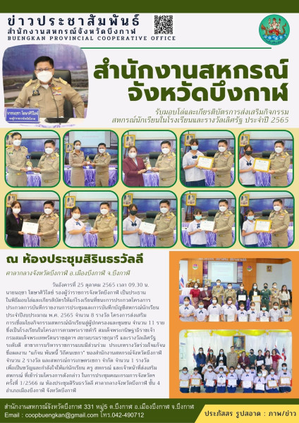 จังหวัดบึงกาฬ มอบโล่และเกียรติบัตรการส่งเสริมกิจกรรมสหกรณ์นักเรียนในโรงเรียน และรางวัลเลิศรัฐ ประจำปี 2565