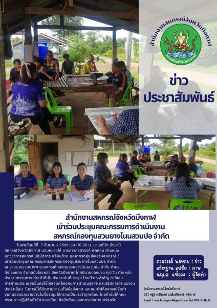 วันพฤหัสบดีที่ 7 กันยายน 2566 เวลา 10.00 น. นายอภิไท มังธานี สหกรณ์จังหวัดบึงกาฬ มอบหมายให้ นางสาวศรสวรรค์ พลหอม ตำแหน่ง นักวิชาการสหกรณ์ปฏิบัติการ พร้อมด้วย บุคคลากรกลุ่มส่งเสริมสหกรณ์ 3 เข้าร่วมประชุมคณะกรรมการสหกรณ์กองทุนสวนยางโนนสวนปอ จำกัด ณ ลานรวบรวมยางพาราสหกรณ์กองทุนสวนยางโนนสวนปอ จำกัด ตำบลบึงโขงหลง อำเภอบึงโขงหลง จังหวัดบึงกาฬ โดยมีนายทองปาน คุราวัน ตำแหน่ง ประธานกรรมการ ทำหน้าที่เป็นประธานในที่ประชุม โดยมีวาระสำคัญ อาทิเช่น การกำหนดระเบียบขึ้นถือใช้ให้สอดคล้องกับการดำเนินธุรกิจ และสรุปการดำเนินงานประจำเดือน