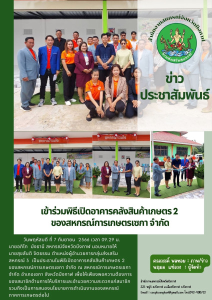 วันพฤหัสบดี ที่ 7 กันยายน 2566 เวลา 09.29 น. นายอภิไท มังธานี สหกรณ์จังหวัดบึงกาฬ มอบหมายให้ นายสุขสันติ จิตธรรม ตำแหน่งผู้อำนวยการกลุ่มส่งเสริมสหกรณ์ 3 เป็นประธานในพิธีเปิดอาคารคลังสินค้าเกษตร 2 ของสหกรณ์การเกษตรเซกา จำกัด ณ สหกรณ์การเกษตรเซกา จำกัด อำเภอเซกา จังหวัดบึงกาฬ เพื่อให้เพียงพอความต้องการของสมาชิกด้านการให้บริการและอำนวยความสะดวกแก่สมาชิก รวมถึงเป็นการสนองนโยบายการดำเนินงานของสหกรณ์ภาคการเกษตรต่อไป