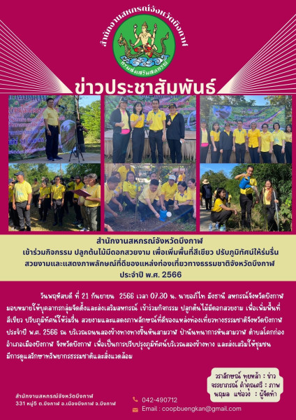 วันพฤหัสบดี ที่ 21 กันยายน 2566 เวลา 07.30 น. นายอภิไท มังธานี สหกรณ์จังหวัดบึงกาฬ มอบหมายให้บุคลากรกลุ่มจัดตั้งและส่งเสริมสหกรณ์ เข้าร่วมกิจกรรม ปลูกต้นไม้มีดอกสวยงาม เพื่อเพิ่มพื้นที่สีเขียว ปรับภูมิทัศน์ให้ร่มรื่น สวยงามและแสดงภาพลักษณ์ที่ดีของแหล่งท่องเที่ยวทางธรรมชาติจังหวัดบึงกาฬ ประจำปี พ.ศ. 2566 ณ บริเวณถนนสองข้างทางทางขึ้นหินสามวาฬ ป่านันทนาการหินสามวาฬ ตำบลโคกก่อง อำเภอเมืองบึงกาฬ จังหวัดบึงกาฬ เพื่อเป็นการปรับปรุงภูมิทัศน์บริเวณสองข้างทาง และส่งเสริมให้ชุมชนมีการดูแลรักษาทรัพยากรธรรมชาติและสิ่งแวดล้อม